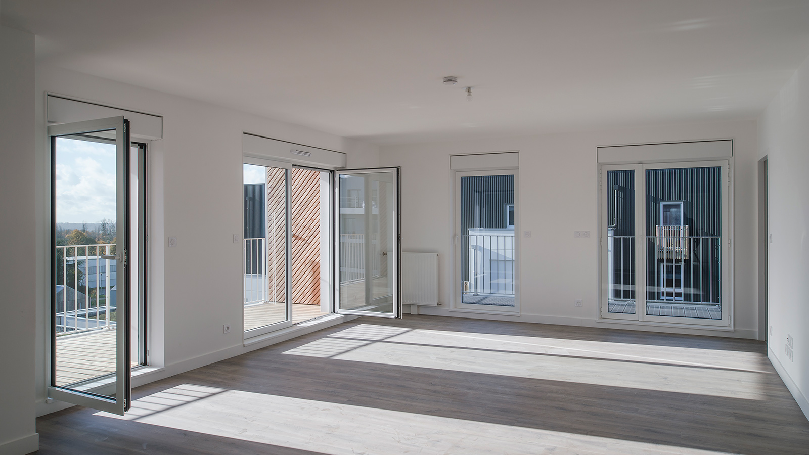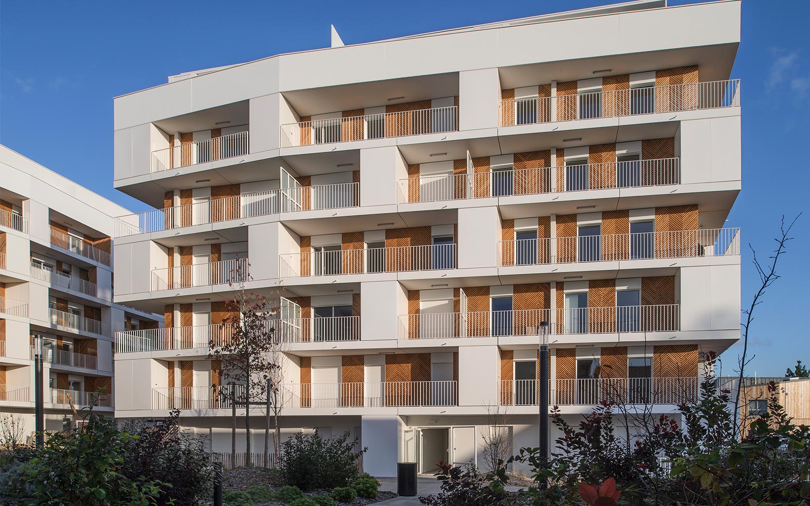 Seeking harmony and reciprocity, a single architectural language is used : a series of broken lines responding to each other and animating the façades. On the first block, you will find two units with facet geometrics made of loggias in a staggered arrangement which are highlighted by herringbone or chevron wood work. As a response, dynamic lines, topped by houses, wiggle on the block at the other side.