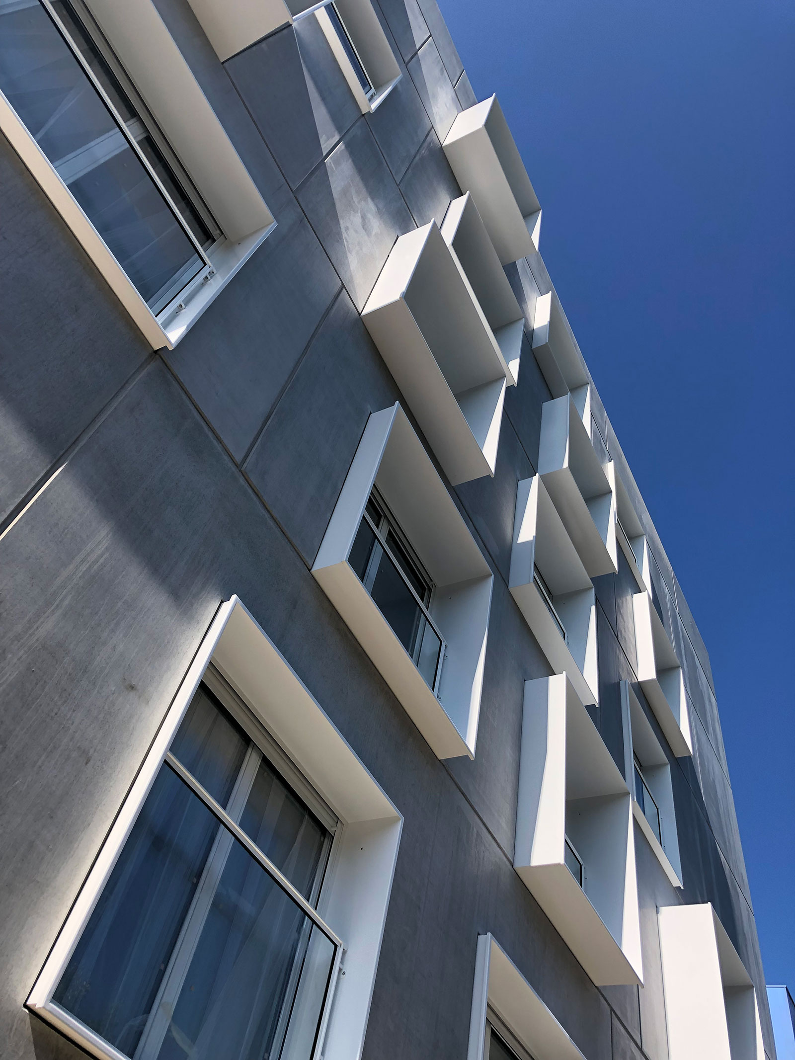 In the north, the façade offers a dialogue with the boulevard and displays a strong identity with extrusion or stamped concrete window frames recalling a chevron pattern. The bar’s attic is dealt with differently. The flats look like small houses on the roofs.
