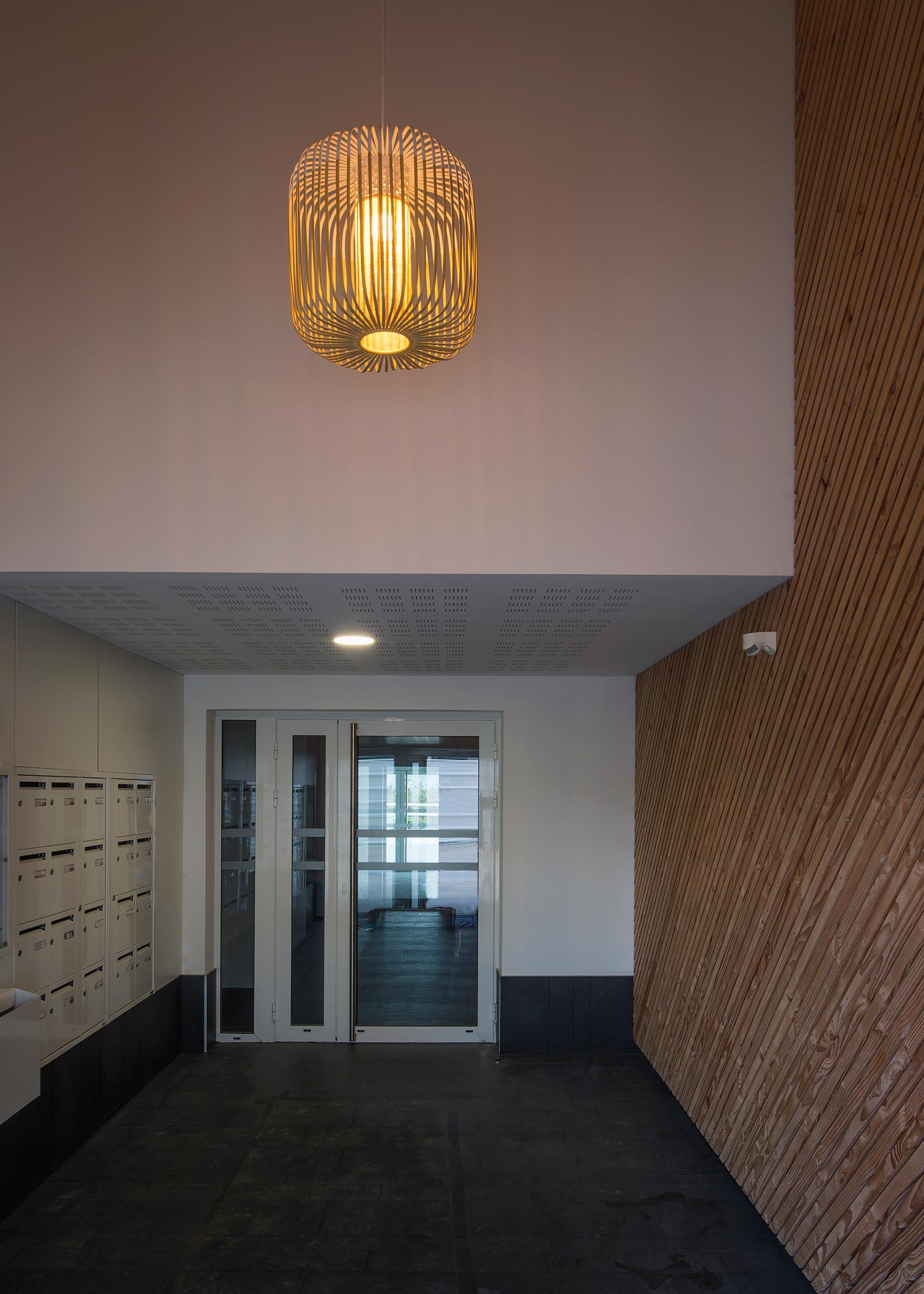 The treatment in elevations brings originality in the heart of a block which is all made of contrast. Each of the ground floors, with their many windows, display their own reflecting games, thus expanding space and perception at pedestrian scale. The higher levels divide into two categories of housing, with long balconies : free figures display wood loggias with cellars, recalling domestic language (chevrons, spikes), while the regular built-up front is altered in its linearity.