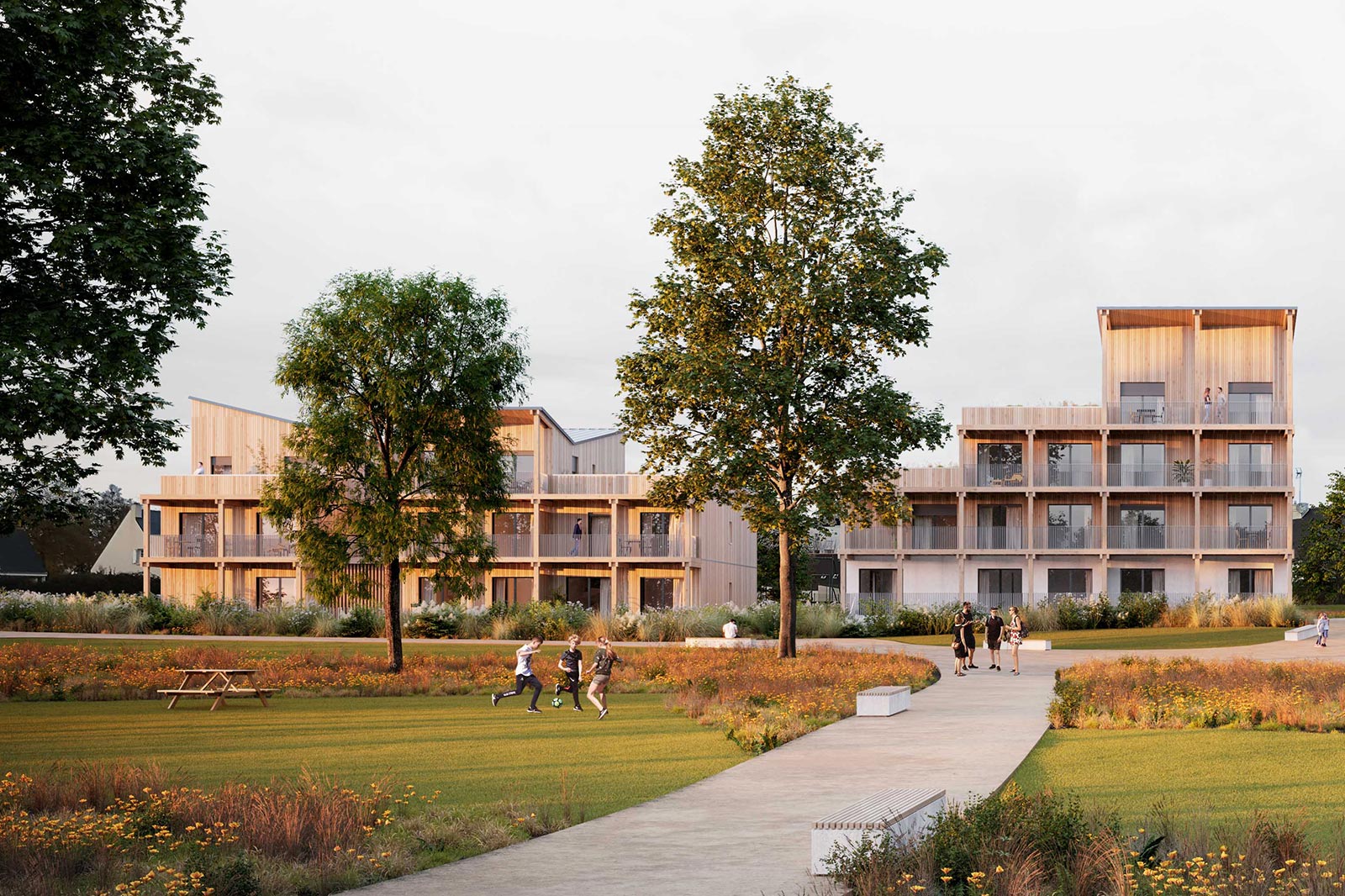Pour répondre à l’environnement pavillonnaire, les îlots sont implantés à juste distance des habitations existantes, et ce, en proposant un jeu d’épannelage, en interprétant les toitures archétypales de la maison, et en se parant d’émergences pour animer ce nouveau paysage bâti. Au-delà d’une résonance singulière avec l’environnement bâti, le projet s’insère dans le prolongement des usages sportifs (gymnase, terrains de tennis et stade) et associés, se confondant avec les aménagements publics. Composée de sujets remarquables préservés, la frange arborée au sud de la parcelle est révélée, magnifiée, se transformant alors en jardin public libre d’accès, ouvert sur la ville.