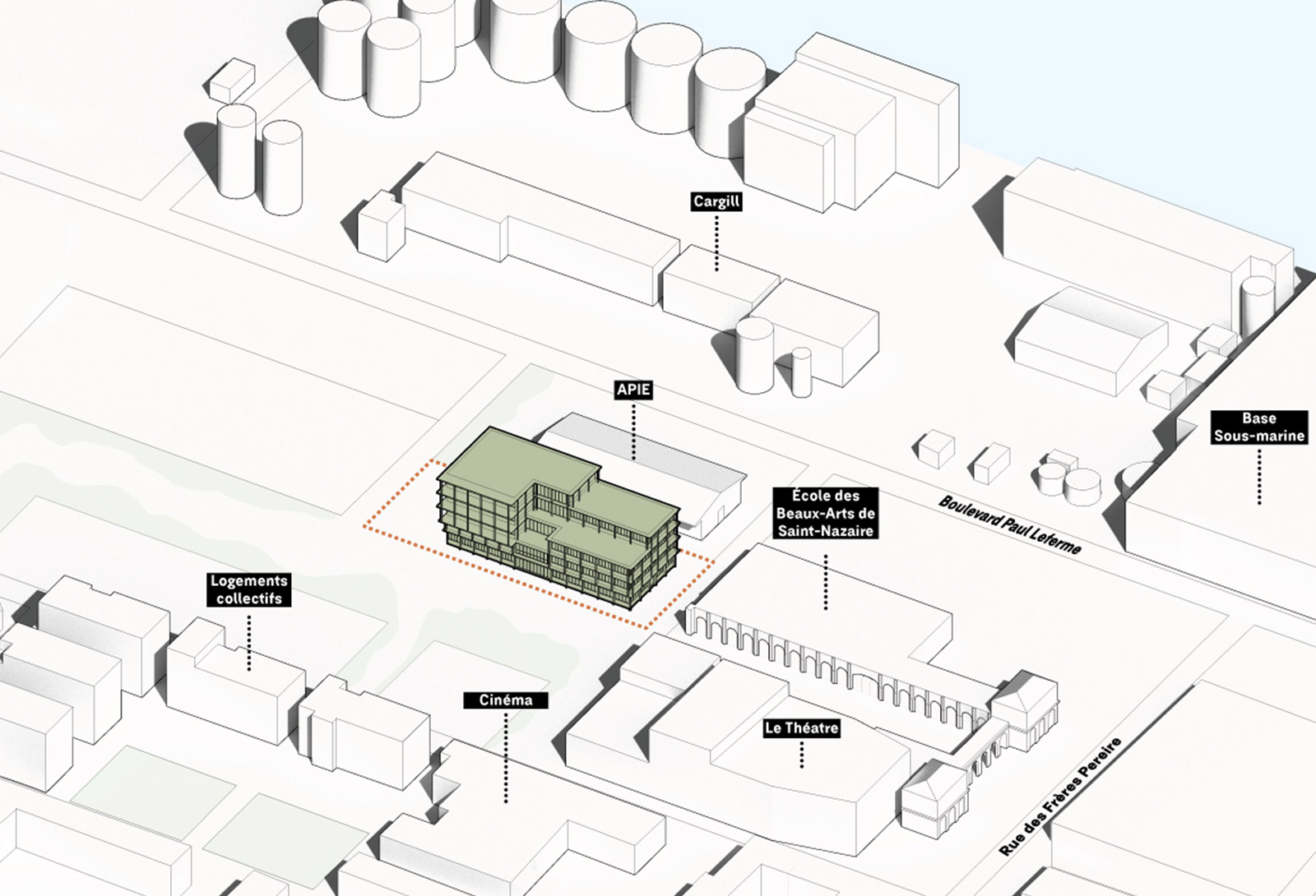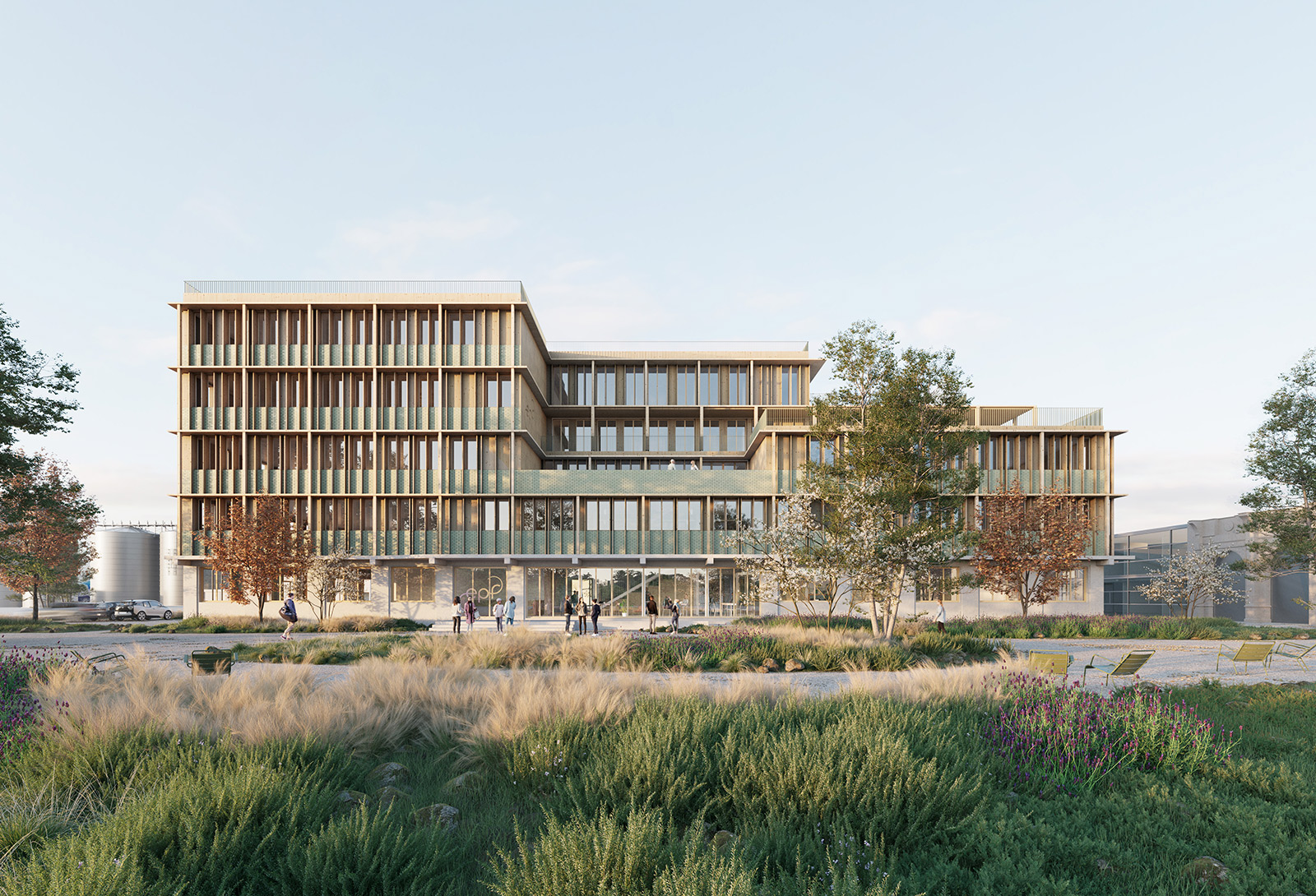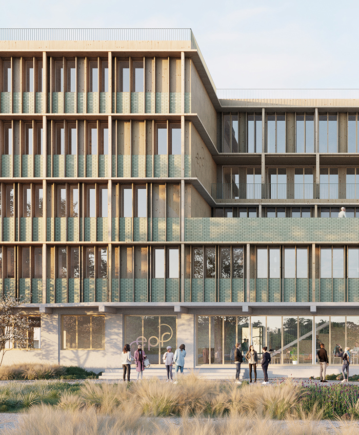 Le projet est conçu avec une volumétrie simple, compacte et fonctionnelle, cherchant à s’intégrer harmonieusement à son environnement. Partant d’un volume maximum à R+4, le projet se déhanche, en fonction des orientations, des accès, et de son organisation. Dans la filiation de la fiche de lot, le bâtiment propose un épannelage progressif allant de R+2 au Sud jusqu’à R+4 au Nord. L’enveloppe du bâtiment est constituée de façades en ossature bois et de menuiseries tramées, qui permettent une interaction entre l’intérieur et l’extérieur. La transparence du bâtiment offre une vue sur l’activité et la vie intérieure, selon le plan et les orientations. Des modénatures bois verticales et horizontales en saillie participent à la protection solaire passive tout en répartissant les pleins et les vides.