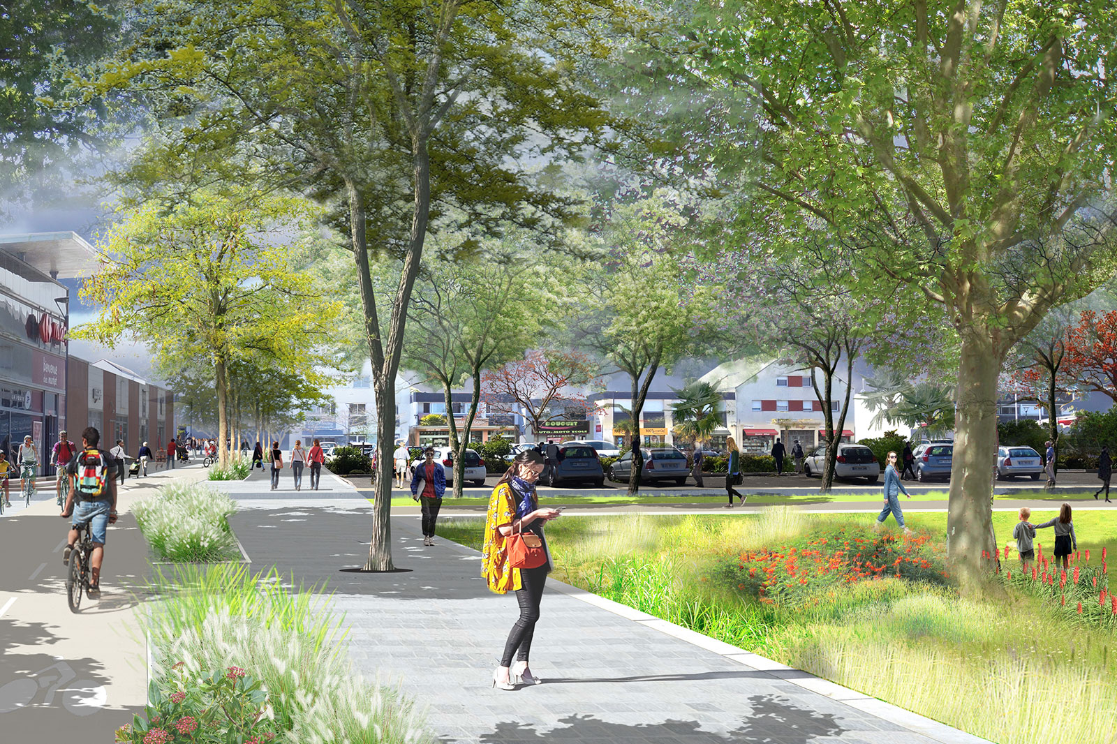 Les mobilités sont entièrement repensées en lien avec l’appareil commercial et les équipements publics. La trame d’espaces publics est apaisée et qualifiée par le végétal à partir de deux axes ‘nature et jardins’, offrant des lieux d’attrait et des espaces publics fédérateurs.