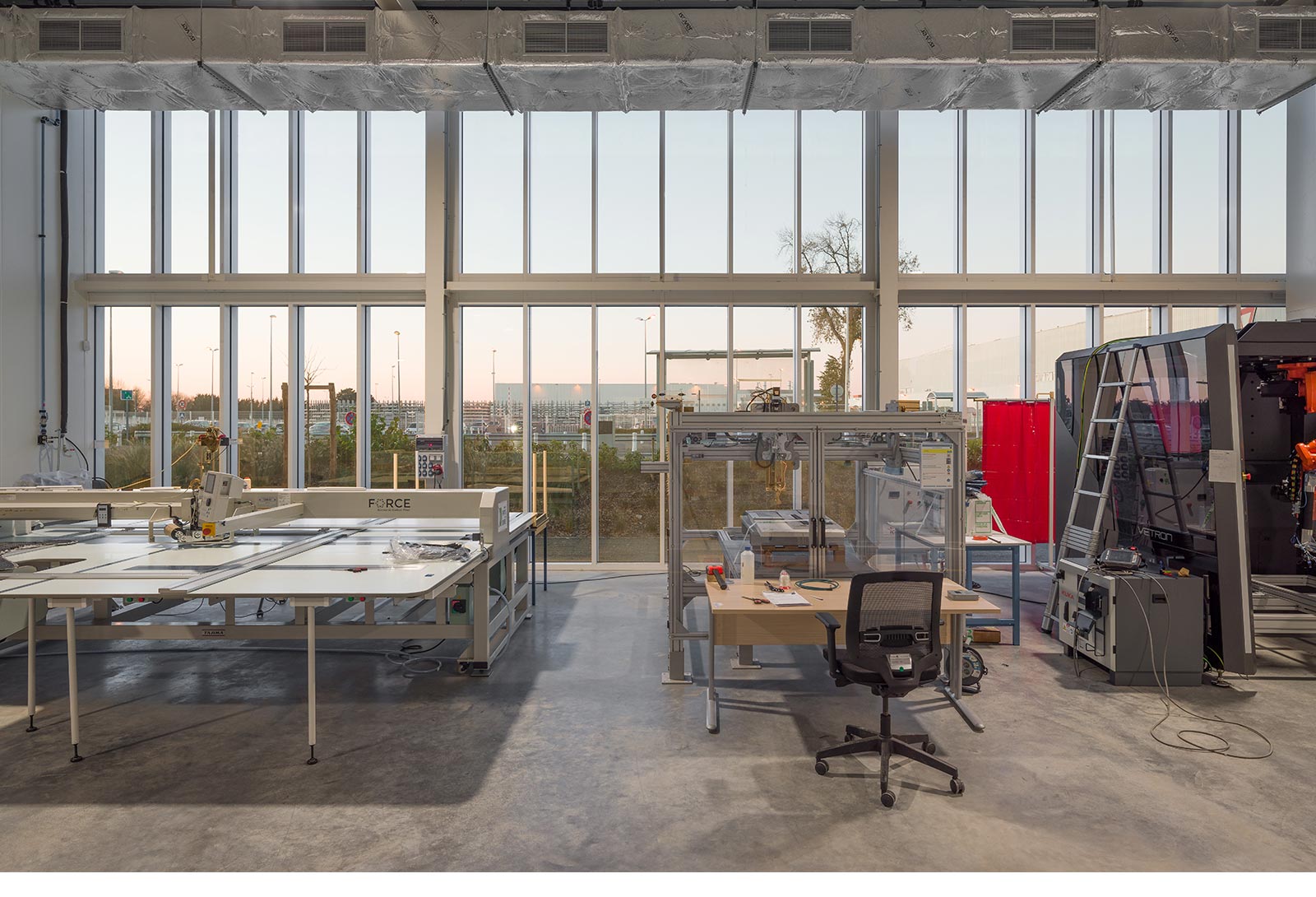 Des espaces extérieurs accueillent zone de stationnements visiteurs et personnels, locaux vélos, terrasses, patio, cour de livraison des halles techniques, espaces de démonstration des halles, …