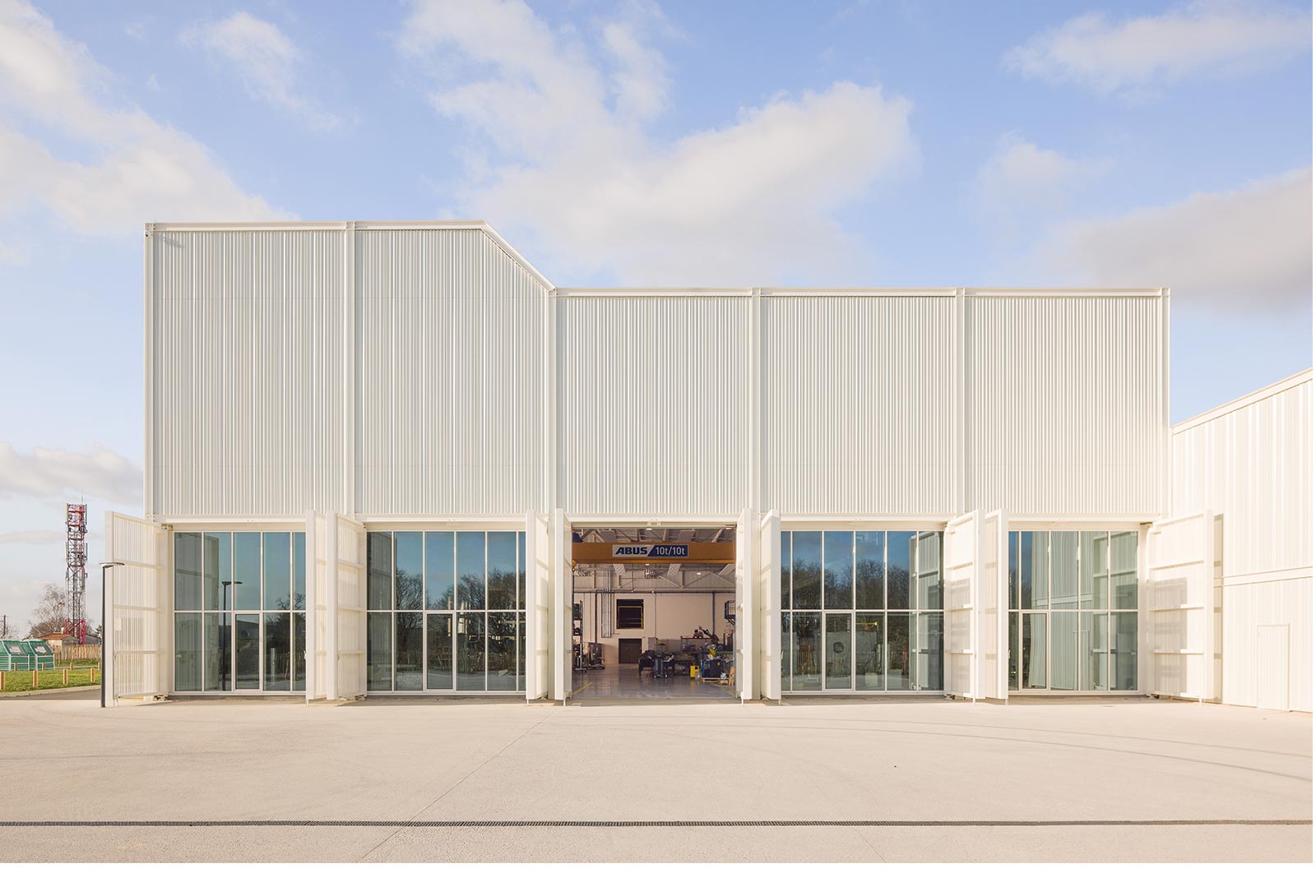 Matérialité : ossature métallique recyclable, bardage métallique ou polycarbonate, menuiseries alu. laquées, toitures végétalisées.