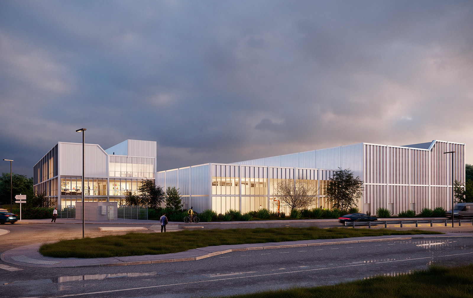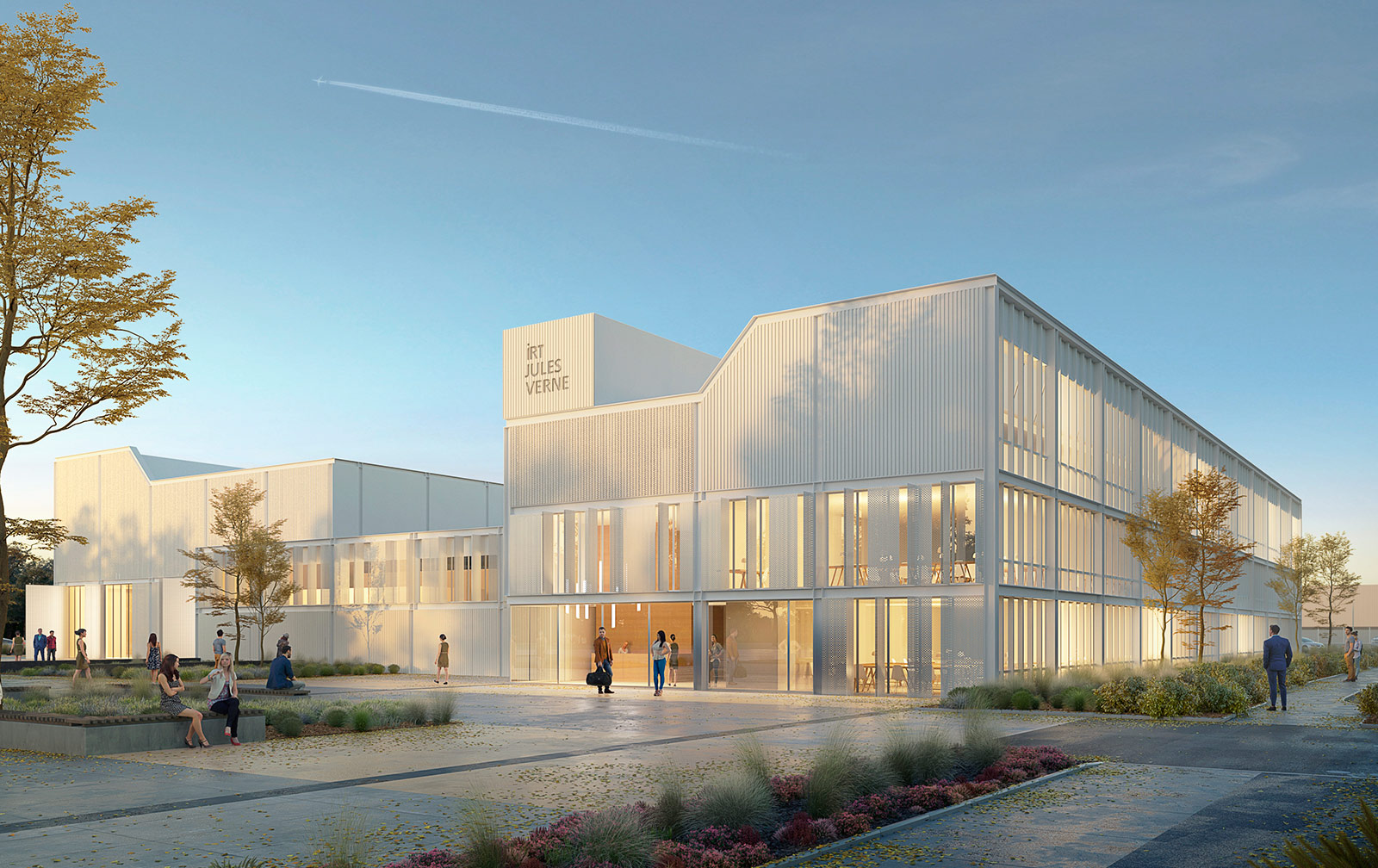 Center for research and technological innovation applied to leading-edge industrial sectors (Aeronautics, Shipbuilding, Transports and Renewable Marine Energies), the IRT Jules Verne will organize in 2022 in 3 identifiable buildings, design so that the shifts in volumes and the division in proportions make it possible to visually distinguish the different uses :