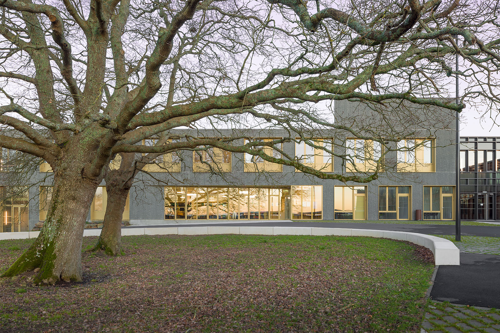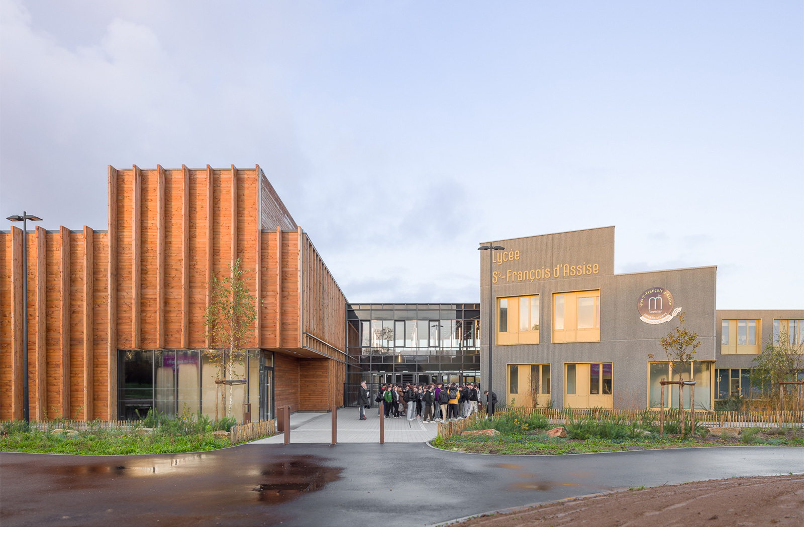 Equipement stratégique en entrée de ville, ce Lycée épouse la forte topographie du site et se déploie en U autour d’une cour paysagée et étagée, s’ouvrant sur le paysage remarquable (zone humide).