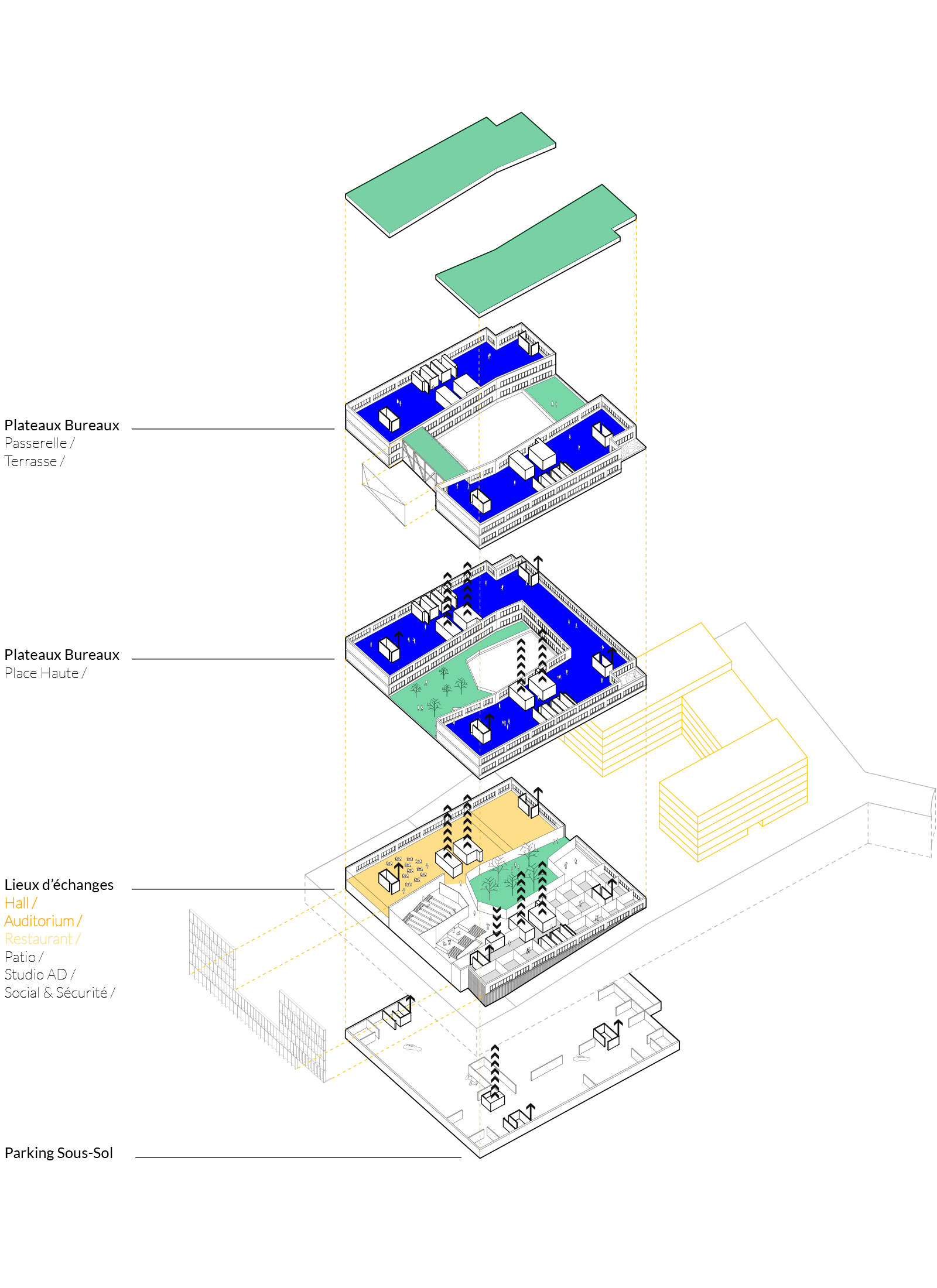 This unit is designed on a common foundation, with a patio at the center, heart of the project, around which East/West oriented office floors are articulated ; these floors are themselves linked by footbridges, allowing space for convivial moments and meetings.