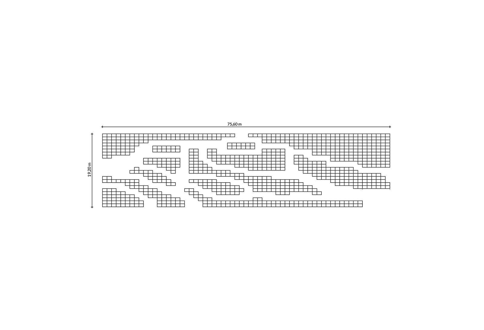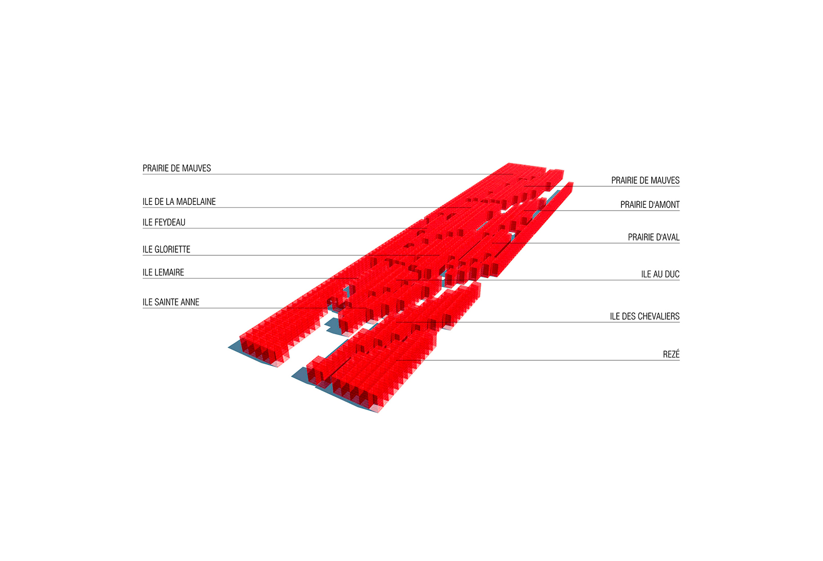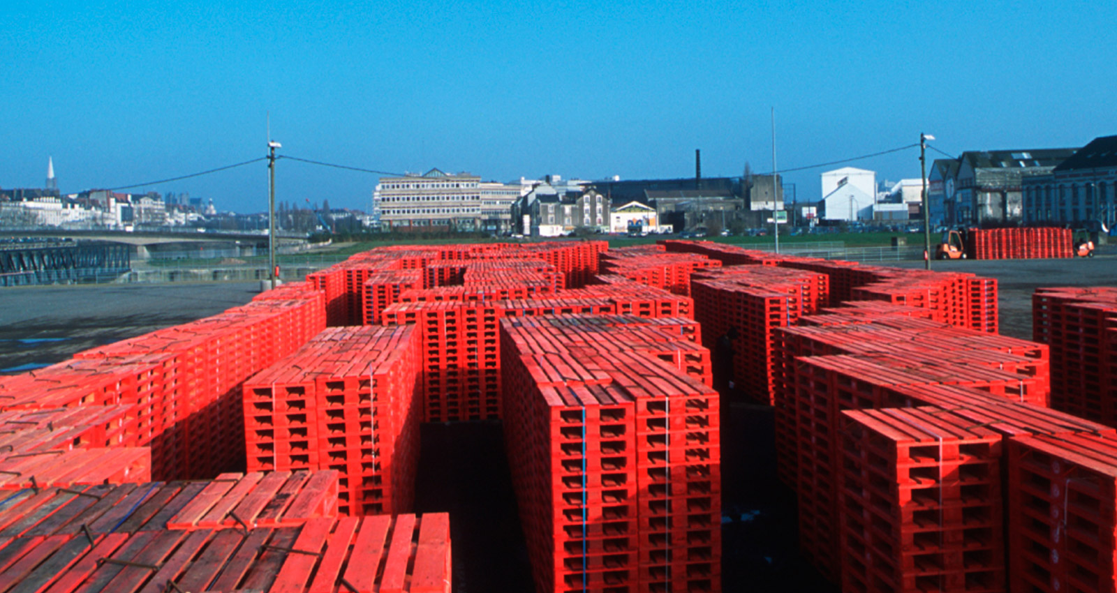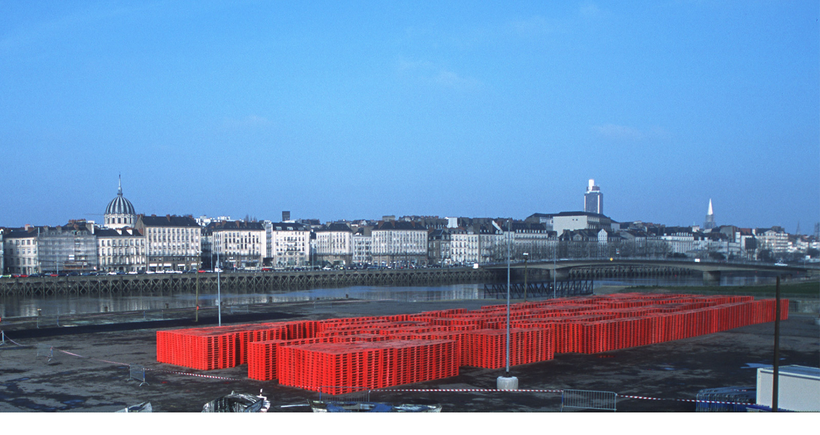 Seen from above, this structure – 80 by 20 meters – represents the former islands of the river Loire before the fillings in Nantes. It is made up of 13 000 pallets, piled up in columns by 15. Seen from the ground, the structure forms a labyrinth in which one can wander.