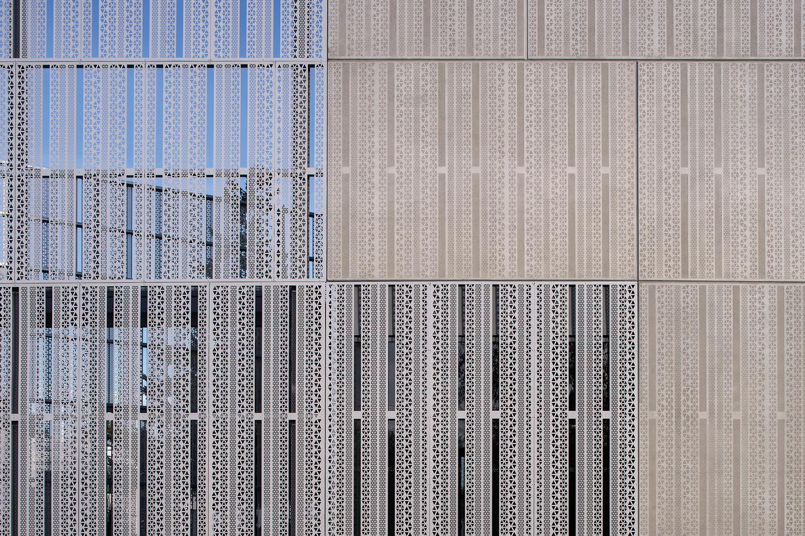 Cette maille joue un rôle important dans le projet. D’une part, elle participe à la protection solaire des locaux en été, sans bloquer les échappées visuelles et permet la pénétration du soleil en hiver. D’autre part, elle joue un rôle de « Claustra » permettant de maîtriser la confidentialité des locaux vis-à-vis de l’extérieur. Cet aspect de protection visuelle prend son sens notamment pour les laboratoires de recherche. Enfin, par sa texture lisse, aux perforations variables en fonction des orientations, elle unifie l’image du bâtiment, tout en créant une vibration à l’échelle de l’édifice.